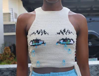 • Crochet vest with teary eyed graphic image designed by us and hand-beaded falling tears.